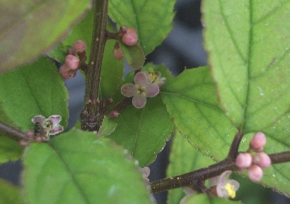 会員yamさんから、実生したウメモドキをいただきました。 「雄・雌は来年花が咲いた時のお楽しみねっ」 っと。 待つ事約一年・・・。 わぁ〜〜いっ♪咲きました! もういっちょ。
