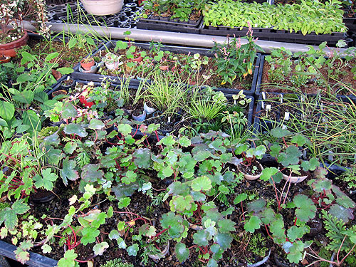 薄い緑はホトトギス(紫酔)の実生 ・ 濃い緑は丸葉のホトトギスの株分