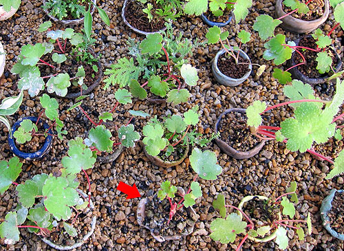 下の赤い矢印の鉢は、小鉢に移した時に写真撮った大文字草です