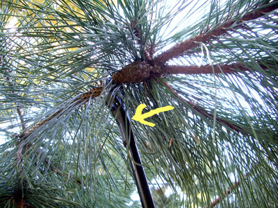 背が高い松なので・・・例のヤツが登場です。黄色い矢印に注目です。