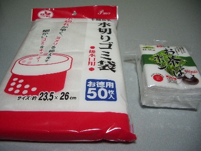 左)水切りゴミ袋 50枚 98円 右)お茶パック 60枚 68円