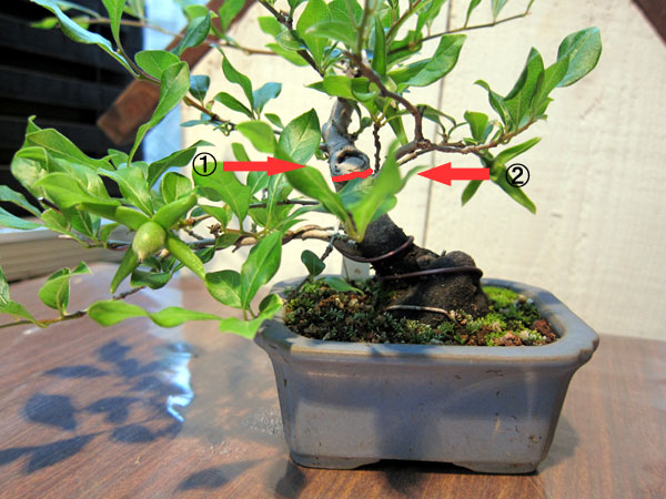 ①の赤いラインで切り ②の枝を芯に立替てみる事にしました。