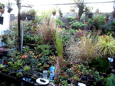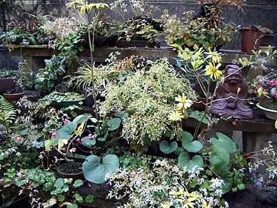 広い庭を埋め尽くす山野草&盆栽たち
